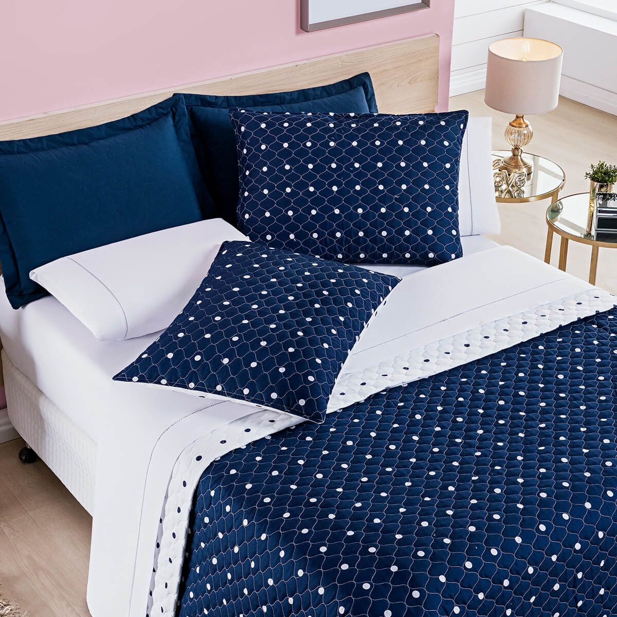 Cobre Leito Solteiro Petit Poá Versatilidade e Charme em Dupla Face - MarinhoDupla FaceDois looks em um! Cobre Leito Solteiro Petit Poá dupla face com a clássica estampa de bolinhas e a elegância do matelassê. Toque macio do tecido 200 fios. 01 Cobre leito 2,40m x 1,80m01 Porta travesseiro Composição:Tecido: 100% PoliésterPercal: 200 fiosEnchimento: 100% PoliésterSOLTEIRO a partir de