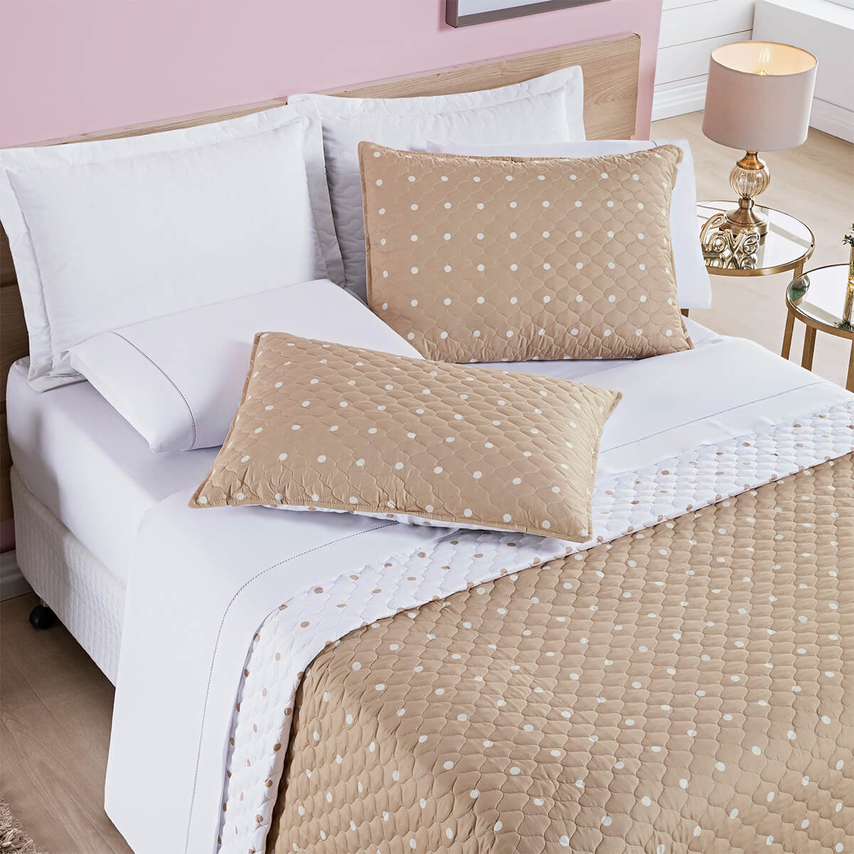 Cobre Leito Solteiro Petit Poá Versatilidade e Charme em Dupla Face - AvelãDupla FaceDois looks em um! Cobre Leito Solteiro Petit Poá dupla face com a clássica estampa de bolinhas e a elegância do matelassê. Toque macio do tecido 200 fios. 01 Cobre leito 2,40m x 1,80m01 Porta travesseiro Composição:Tecido: 100% PoliésterPercal: 200 fiosEnchimento: 100% PoliésterSOLTEIRO a partir de