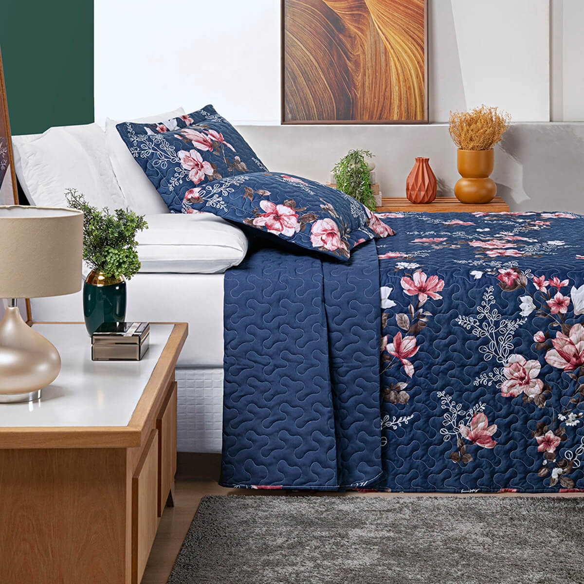 Cobre Leito Queen Avere Dupla Face 200 Fios em Matelassê - BothanicaToque MacioDupla FaceVersatilidade e charme para sua cama queen. Cobre Leito Avere dupla face (um lado floral, outro liso) com a elegância do acabamento em matelassê. Renove seu quarto! 01 Cobre leito 2,60m x 2,40m02 Porta travesseirosComposição: Superior e Inferior 100% PoliésterEnchimento: 100% PoliésterQUEEN a partir de