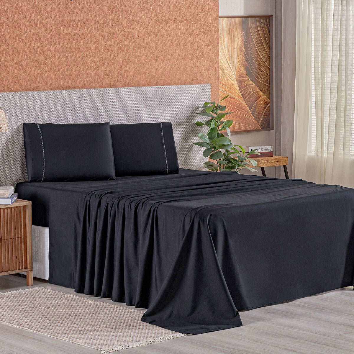 Jogo de Lençol King Aurora Completo 4 Peças Cores que Duram - Preto400 FiosVista sua cama king com personalidade. Jogo de Lençol Aurora 4 peças com cores vibrantes que não desbotam, toque macio e o charme do ponto palito. Peça já! 01 Lençol de cima 2,80m x 2,40m01 Lençol de baixo com elástico 2,03m x 1,93m x...KING a partir de