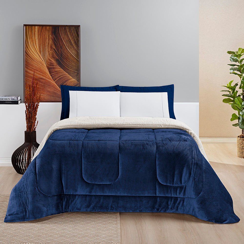 Coberdrom King Everest O Ápice do Conforto para o Inverno Rigoroso - MarinhoInvernoToque MacioExperimente o ápice do conforto. Coberdrom King Everest com toque flannel e o calor superior da lã de carneiro (sherpa). Mais quente, mais macio, mais luxo.1 Coberdrom 2,60m x 2,40m Composição:Sherpa: 100% PoliésterEnchimento: 100% PoliésterManta Microfibra: 100% PoliésterKING a partir de