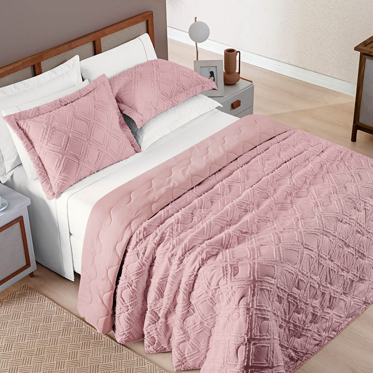 Cobre Leito Queen Aveline: Toque macio e Visual 3D Impecável - RosêDupla FaceQuando a cama é o ponto alto do quarto. O cobre leito Aveline aposta em uma textura 3D de leitura rica, que adiciona volume elegante sem pesar, e em porta-travesseiros com aba americana para um acabamento impecável de alta decoração. O verso coordenável entrega...QUEEN a partir de
