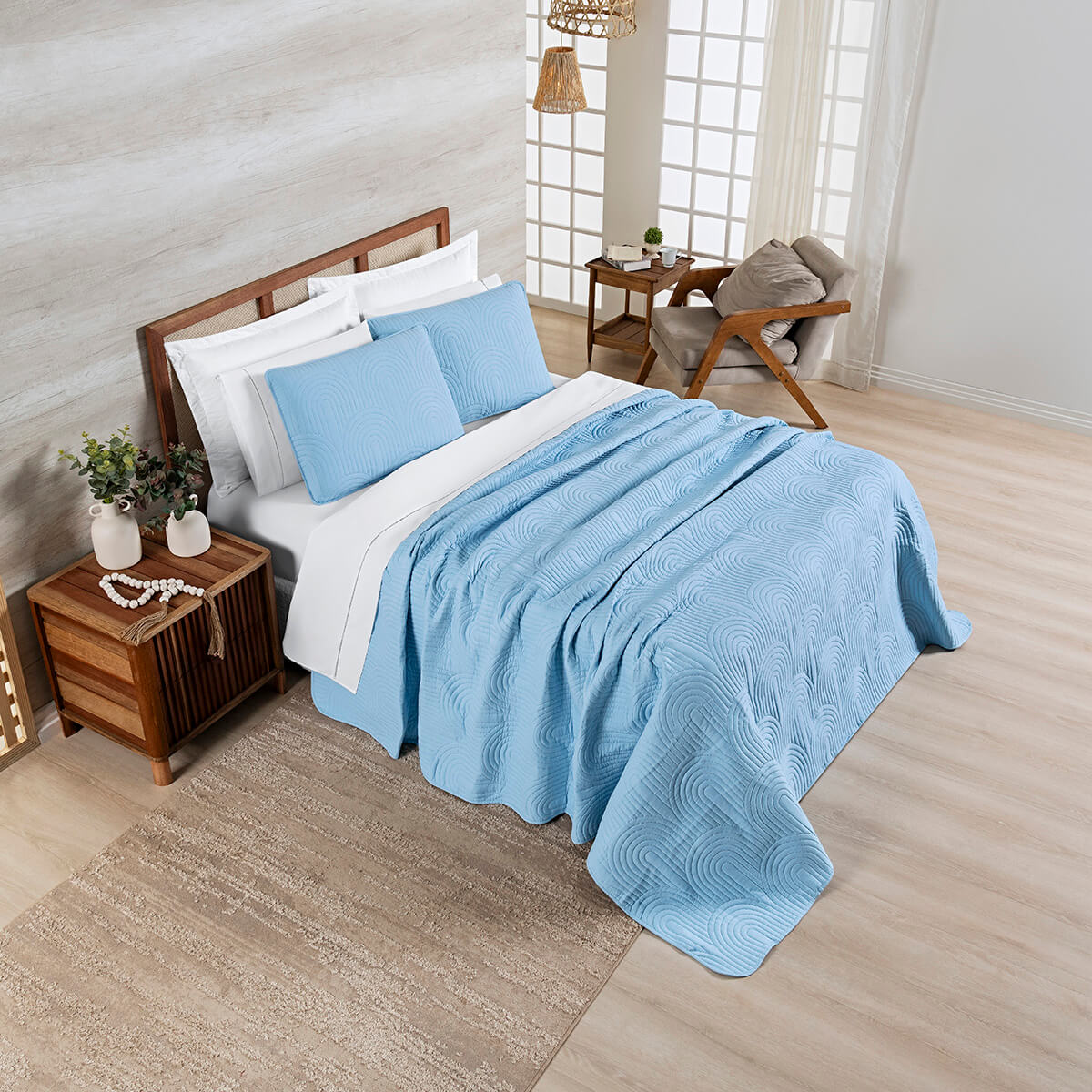 Cobre Leito Casal Arcos: Leve, Macio e Sempre Harmônico - Nuvem AzulToque MacioCom desenho de matelado em arcos e paleta neutra, o cobre leito Arcos traz leveza visual e conforto imediato. O enchimento super soft realça o volume sem pesar, deixando a cama sempre harmoniosa.1 Colcha 2,40m x 2,20m2 Porta Travesseiros 70cm x 50cm Composição:Tecido: Percal...CASAL a partir de