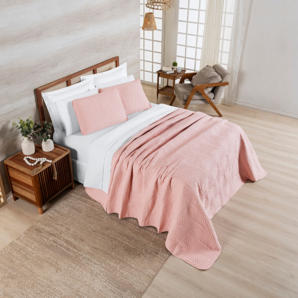 Cobre Leito King Arcos: Acabamento de Hotel e Maciez Super Soft - Sal RosaToque MacioTextura que acalma e visual que organiza: o cobre leito Arcos combina matelado ultrassônico em formato de arco com uma paleta neutra fácil de compor. O enchimento super soft garante aconchego imediato e caimento leve na cama king.1 Colcha 2,80m x 2,60m2 Porta Travesseiros...KING a partir de