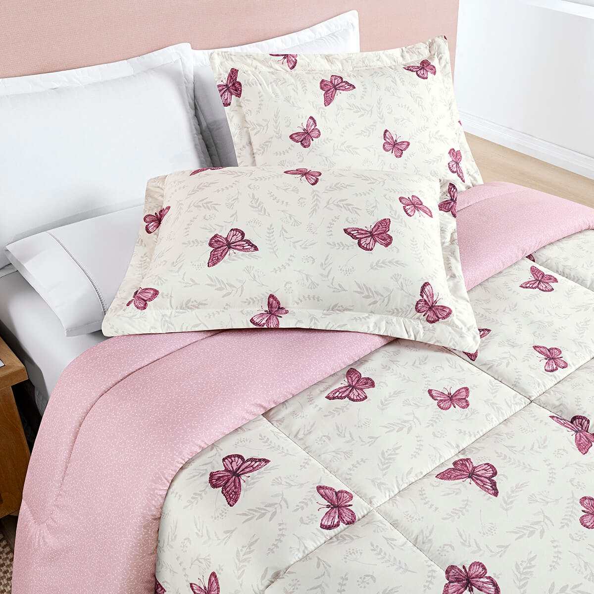 Kit Edredom Queen Avere 200 Fios com Porta Travesseiro - BorboletasToque MacioInvernoDupla FaceAconchego e delicadeza para a cama de solteiro. Kit Edredom Avere com estampa floral e porta-travesseiro com aba americana. Perfeito para noites de inverno. 01 Edredom 2,40m x 2,20m02 Porta travesseirosComposição: Superior e Inferior 100% PoliésterEnchimento: 100% PoliésterQUEEN a partir de