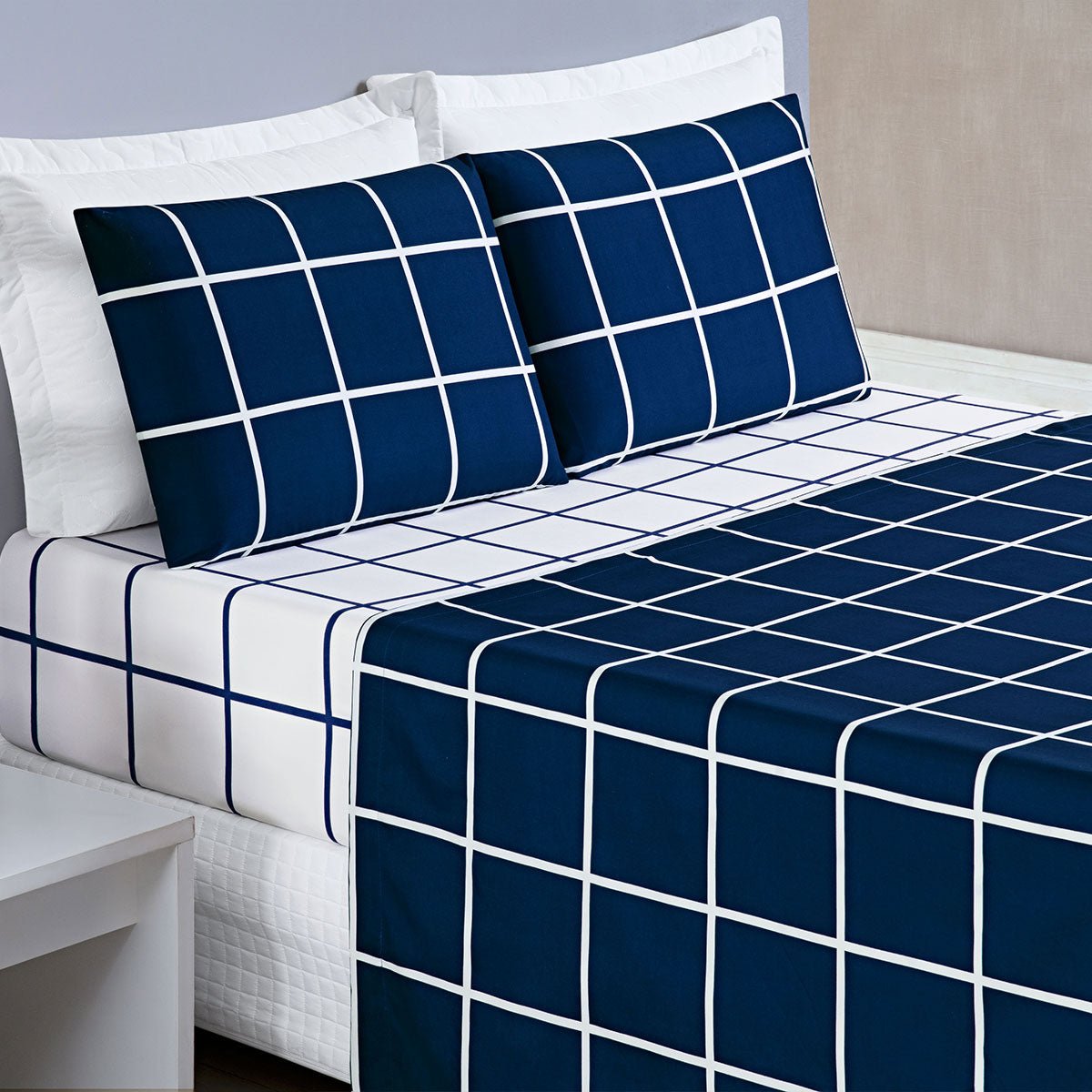 Jogo de Lençol Solteiro Austin 2 Peças Estilo Moderno e Prático - MarinhoUm toque de design para a cama de solteiro. Jogo de Lençol Austin 2 peças com estampa quadriculada moderna e o conforto do tecido 200 fios. Ideal para o dia a dia. 1 Lençol c/ elástico de 1,88m x 88cm x 30cm de alt.1...SOLTEIRO a partir de