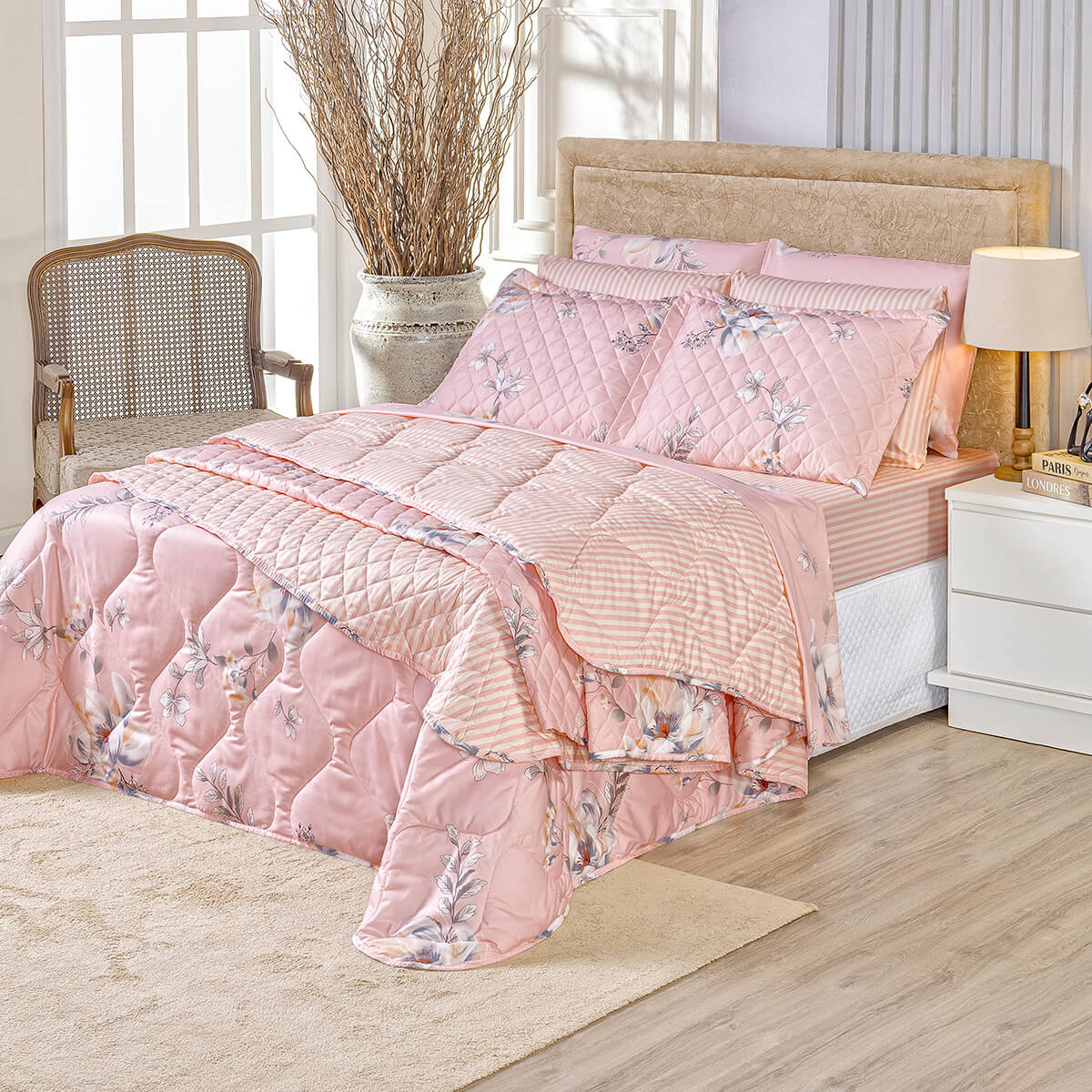 Kit Coordenado Casal Nina 7 Peças 400 Fios: Conforto e Estilo para seu Quarto - NinaLançamentoKit Coordenado400 FiosEleve o nível da sua cama com o Kit Coordenado Casal Nina. A combinação da colcha floral com o lençol liso rosê de 400 fios. Um upgrade de estilo e conforto!Colcha 3 Peças1 Colcha 2,50m x 2,30m2 Porta travesseiros 70cm x 50cm Composição:Percal 400...CASAL a partir de