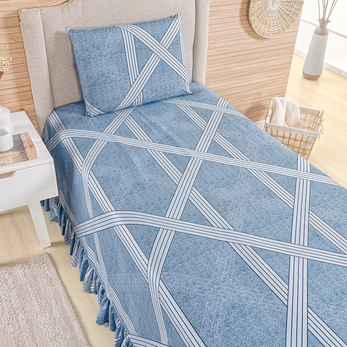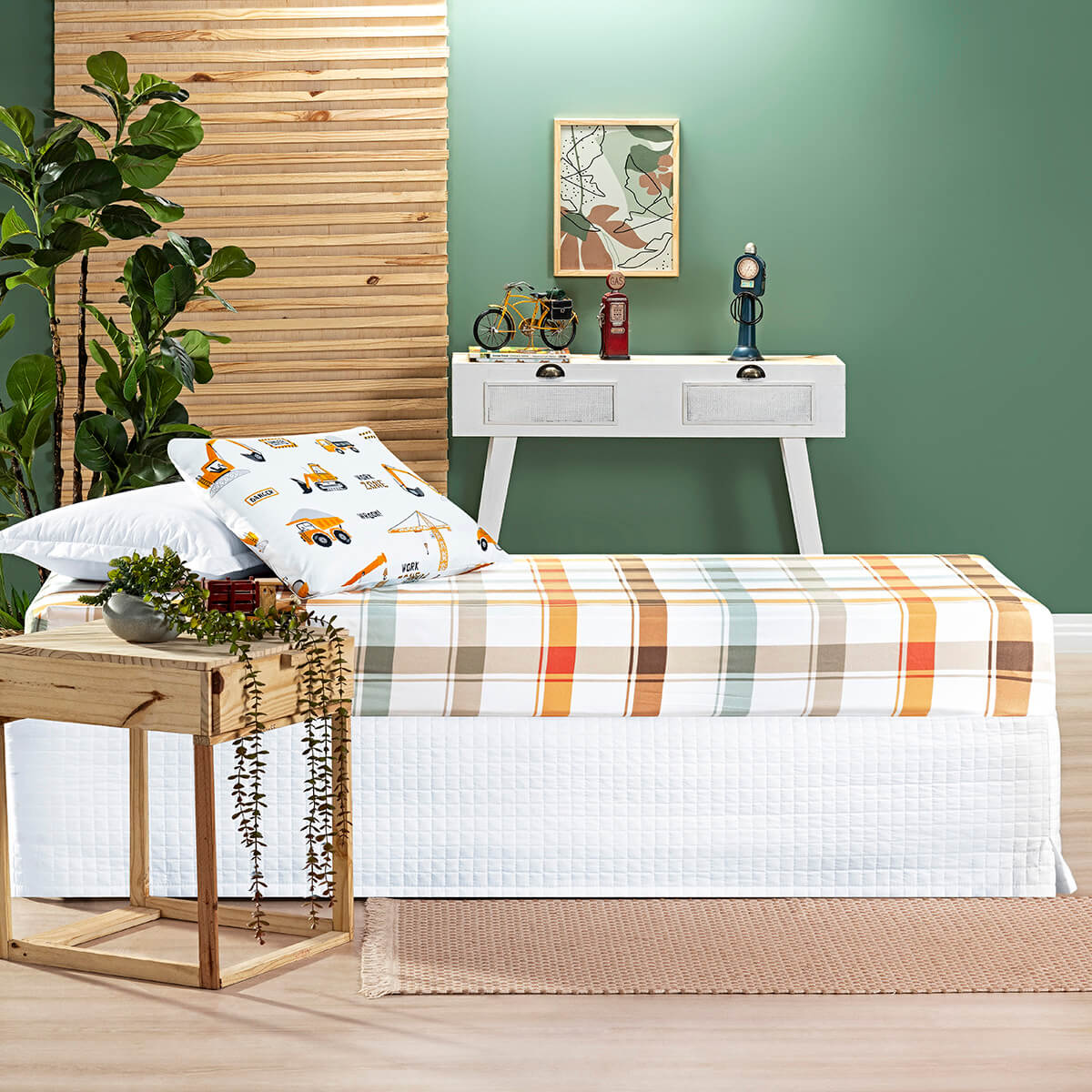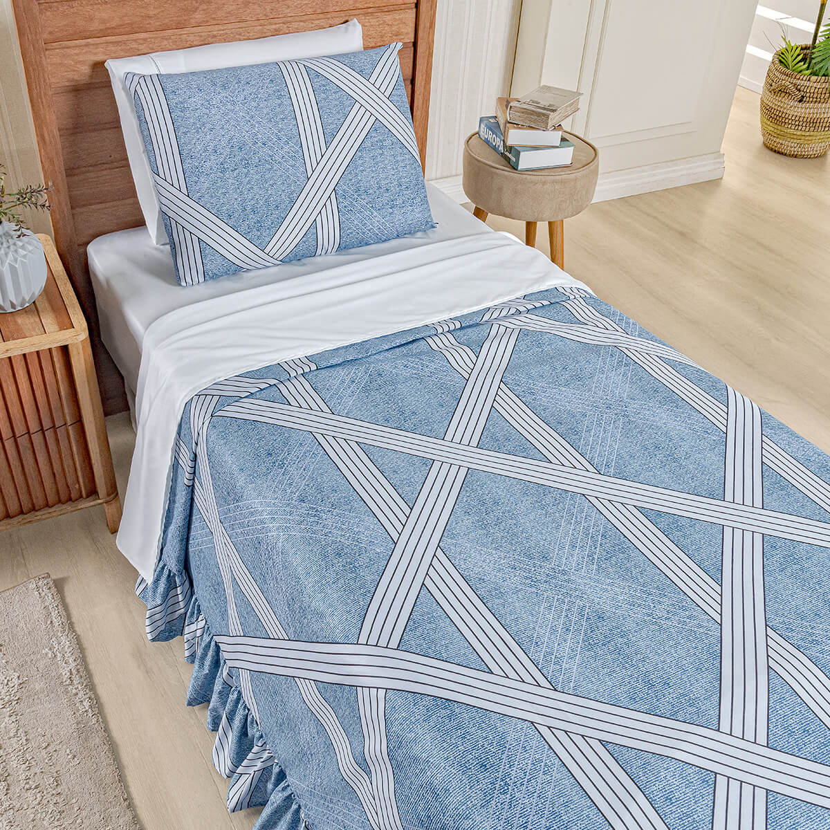 Kit Coordenado Solteiro Zoom: Quarto Jovem com Estilo e Organização - ZoomKit Coordenado400 FiosPara quem busca agilidade diária, o Zoom resolve em três passos: abrir, esticar e admirar. A colcha com babado faz o acabamento imediato; o porta-travesseiro estampado alinha o look; e o lençol de baixo com elástico 30 cm mantém tudo no lugar, reduzindo ajustes....SOLTEIRO a partir de