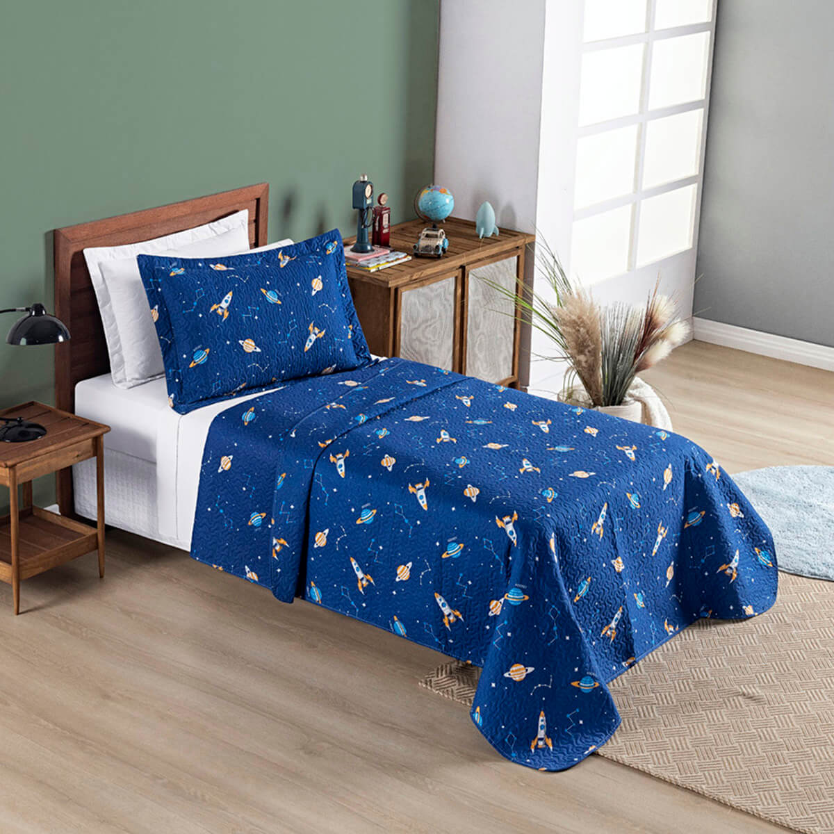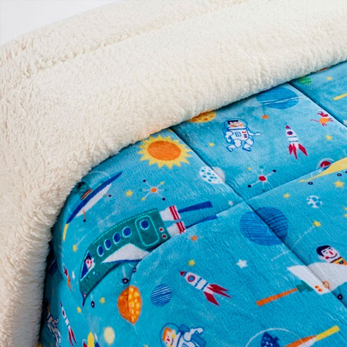 Colcha Infantil Bouti Kids Dupla Face Duas Aventuras em Uma - AstronautaLançamentoInfantilDupla FaceDois universos de aventura em uma só colcha! Dupla face e em matelassê, é perfeita para decorar e brincar. Estampas de game, astronauta, dinos e mais. 1 Colcha 2,40m x 1,60m1 Porta travesseiro 70cm x 50cm Composição:Tecido: 100% PoliésterEnchimento: 100% PoliésterSOLTEIRO a partir de