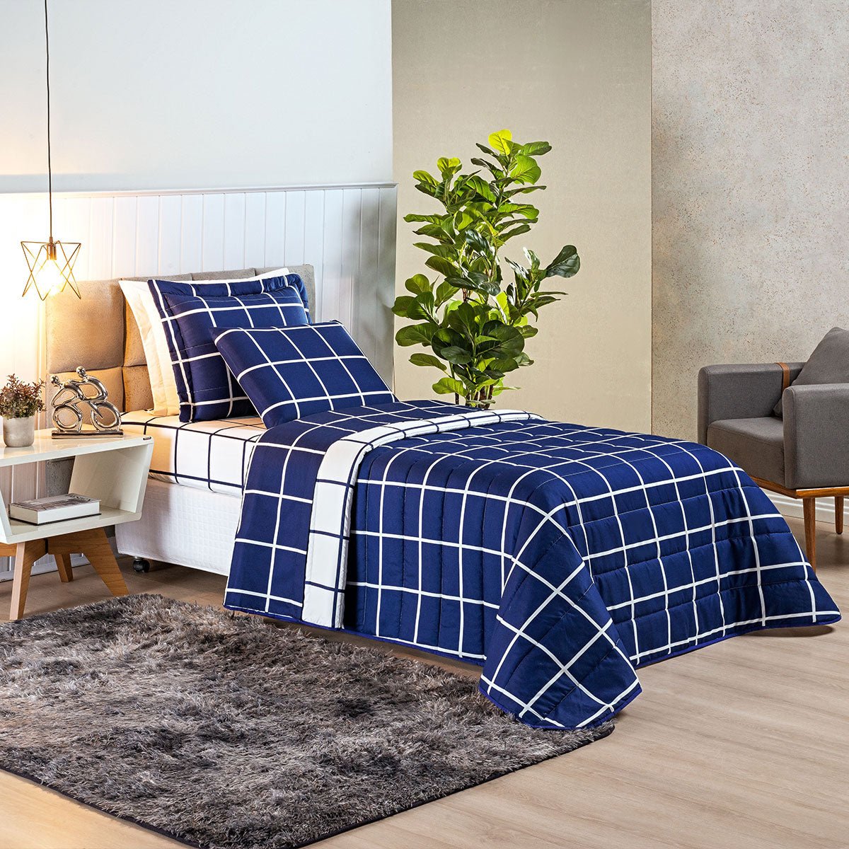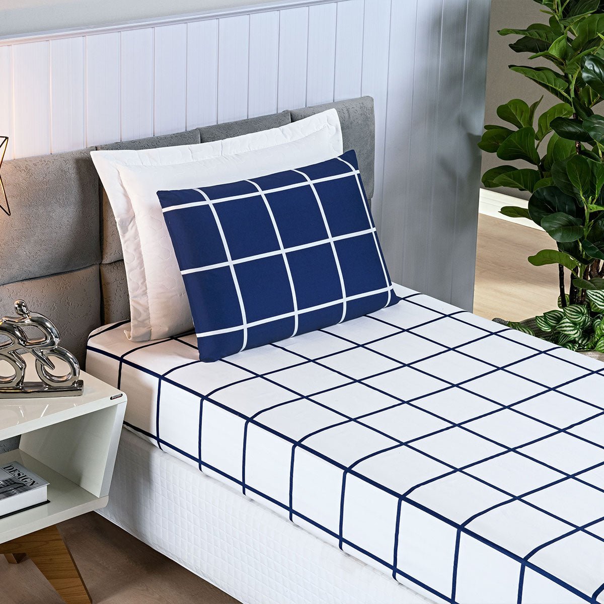 Jogo de Lençol Solteiro Austin 2 Peças Estilo Moderno e Prático - MarinhoUm toque de design para a cama de solteiro. Jogo de Lençol Austin 2 peças com estampa quadriculada moderna e o conforto do tecido 200 fios. Ideal para o dia a dia. 1 Lençol c/ elástico de 1,88m x 88cm x 30cm de alt.1...SOLTEIRO a partir de