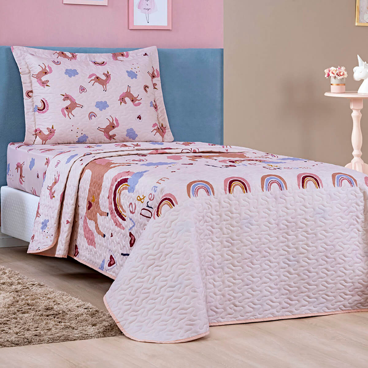 Jogo de Lençol Infantil Menina Bouti Kids Completo 3 Peças - UnicórnioLançamentoInfantilA cama dos sonhos completa! Jogo de Lençol Bouti Kids 3 peças com lençol de cima estampado. Estampas de princesa, unicórnio e mais. Toque macio e confortável. 1 Lençol de cima 2,50m x 1,50m1 Lençol com elástico de 1,90m x 90cm x 30cm1 Fronha...SOLTEIRO a partir de