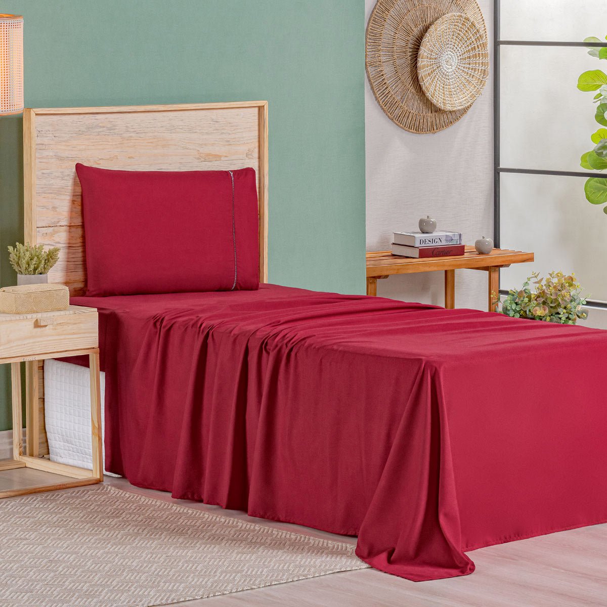 Jogo de Lençol Emilly Solteiro Elegância em Cores Vivas 3 Peças - Vermelho400 FiosCama de solteiro completa e cheia de personalidade. Jogo de Lençol Emilly 3 peças com cores que não desbotam e o elegante acabamento em ponto palito. 1 Lençol de Cima 2,45m x 1,50m1 Lençol c/elástico na volta toda de 1,88m x 0,88m x 0,30m1...SOLTEIRO a partir de