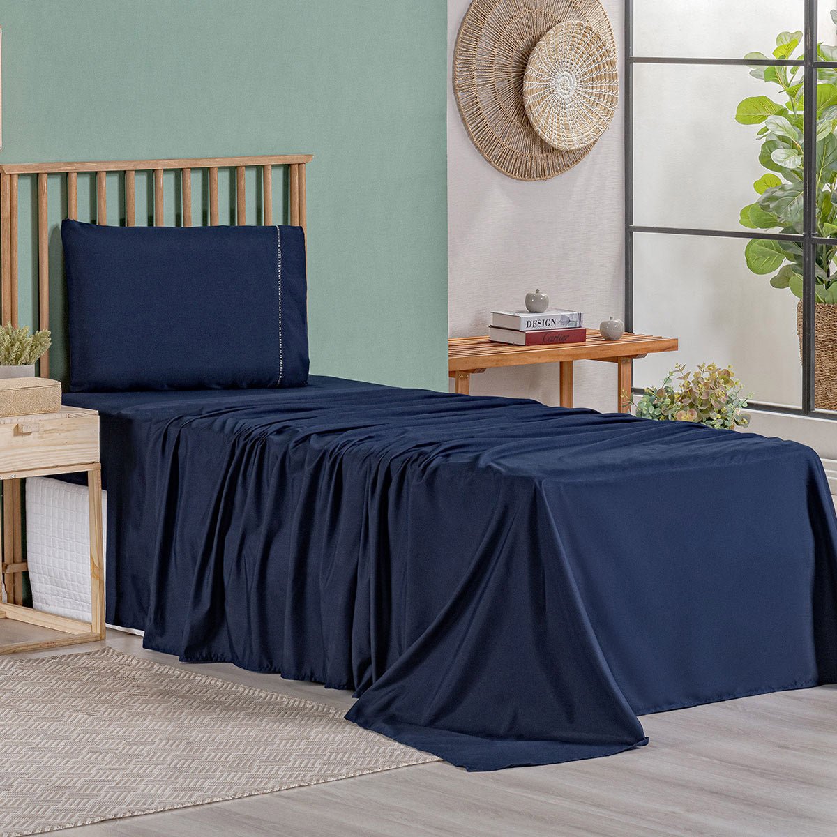 Jogo de Lençol Solteiro Emilly 2 Peças Um Toque de Cor e Estilo - Marinho400 FiosToque MacioAdicione personalidade à cama de solteiro com o Jogo de Lençol Emilly. Cores que não desbotam, toque macio e o charmoso acabamento em ponto palito. Compre já! 1 Lençol com Elástico 1,88m x 0,88m x 0,30m1 Fronha 70cm x 50 cm Composição:Tecido: 100% Poliéster...SOLTEIRO a partir de