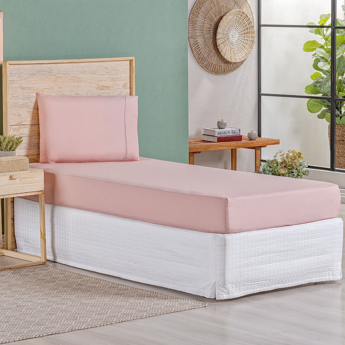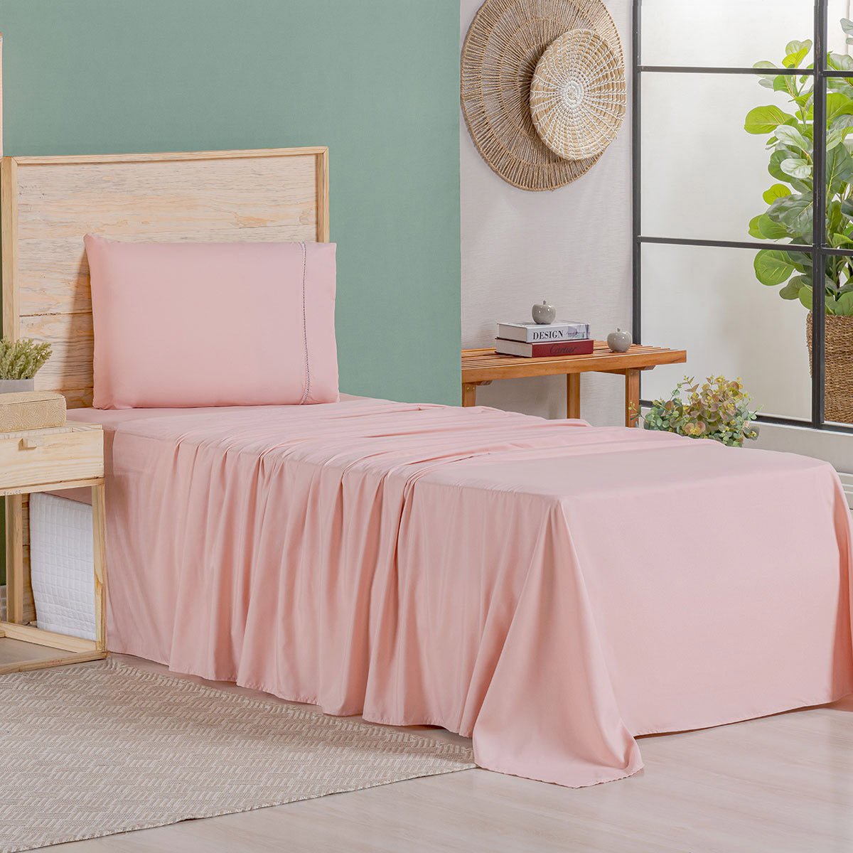Jogo de Lençol Solteiro Emilly 2 Peças Um Toque de Cor e Estilo - Rosê400 FiosToque MacioAdicione personalidade à cama de solteiro com o Jogo de Lençol Emilly. Cores que não desbotam, toque macio e o charmoso acabamento em ponto palito. Compre já! 1 Lençol com Elástico 1,88m x 0,88m x 0,30m1 Fronha 70cm x 50 cm Composição:Tecido: 100% Poliéster...SOLTEIRO a partir de