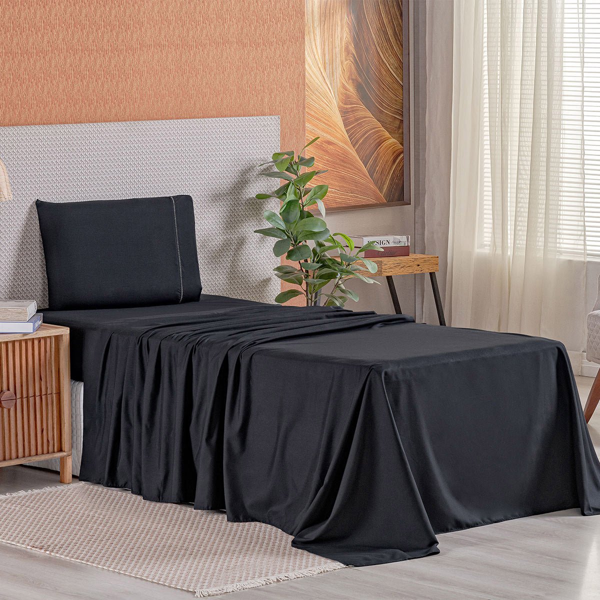 Jogo de Lençol Solteiro Aurora Completo 3 Peças Cores que Duram - Preto400 FiosCama de solteiro completa e cheia de estilo! Jogo de Lençol Aurora 4 peças com cores intensas que não desbotam e acabamento em ponto palito. Não amassa! 1 Lençol de Cima 2,45m x 1,50m1 Lençol com Elástico 1,88m x 0,88m x 0,30m1 Fronha 70cm...SOLTEIRO a partir de