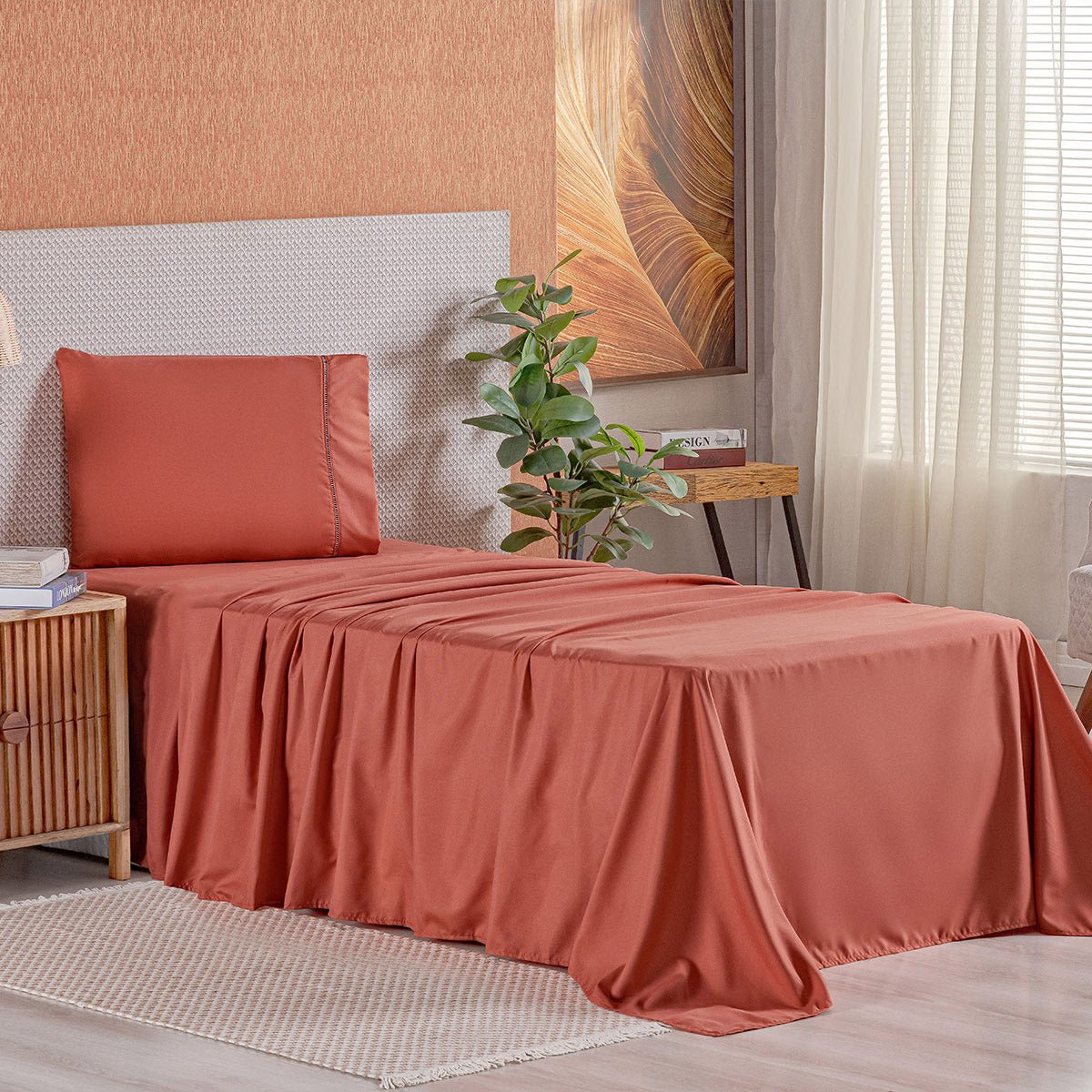Jogo de Lençol Solteiro Aurora Completo 3 Peças Cores que Duram - Terracota400 FiosCama de solteiro completa e cheia de estilo! Jogo de Lençol Aurora 4 peças com cores intensas que não desbotam e acabamento em ponto palito. Não amassa! 1 Lençol de Cima 2,45m x 1,50m1 Lençol com Elástico 1,88m x 0,88m x 0,30m1 Fronha 70cm...SOLTEIRO a partir de