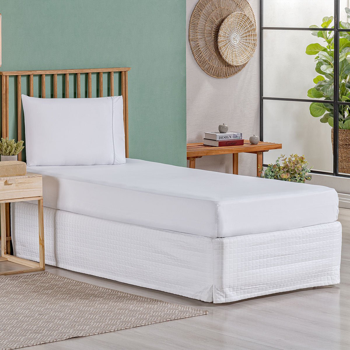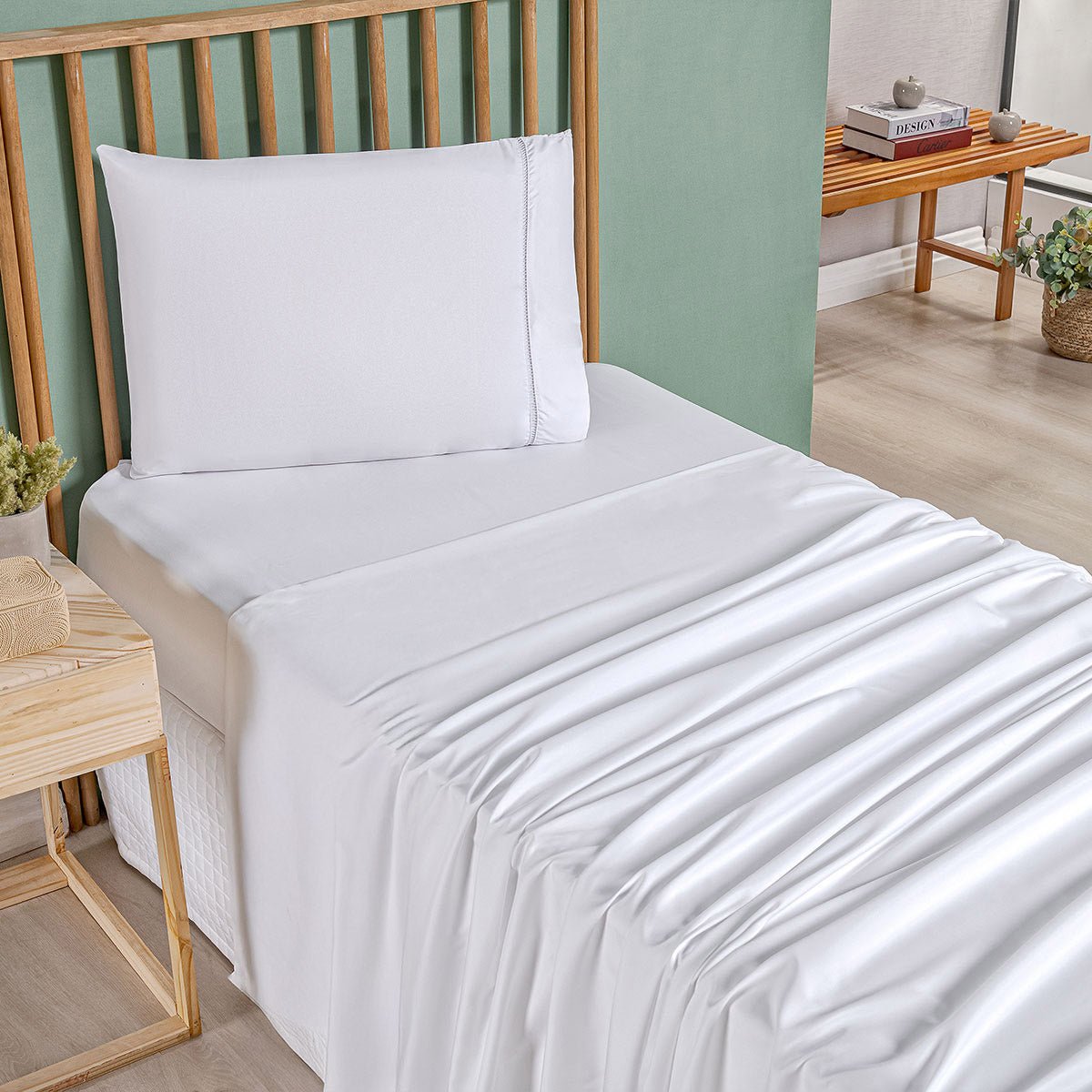 Jogo de Lençol Solteiro Camilly 400 Fios Elegância Minimalista 2 Peças - Branco400 FiosMais VendidosElegância e sobriedade para sua cama. Jogo de Lençol Camilly com cores neutras, toque macio e o charmoso acabamento em ponto palito. Compre online! 1 Lençol com Elástico 1,88m x 0,88m x 0,30m1 Fronha 70cm x 50 cm Composição:Tecido: 100% Poliéster | Percal 400...SOLTEIRO a partir de