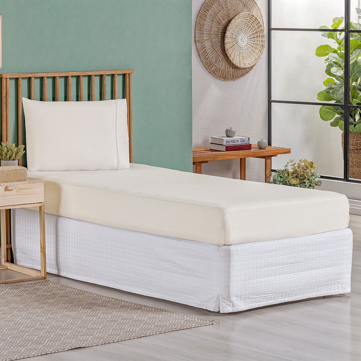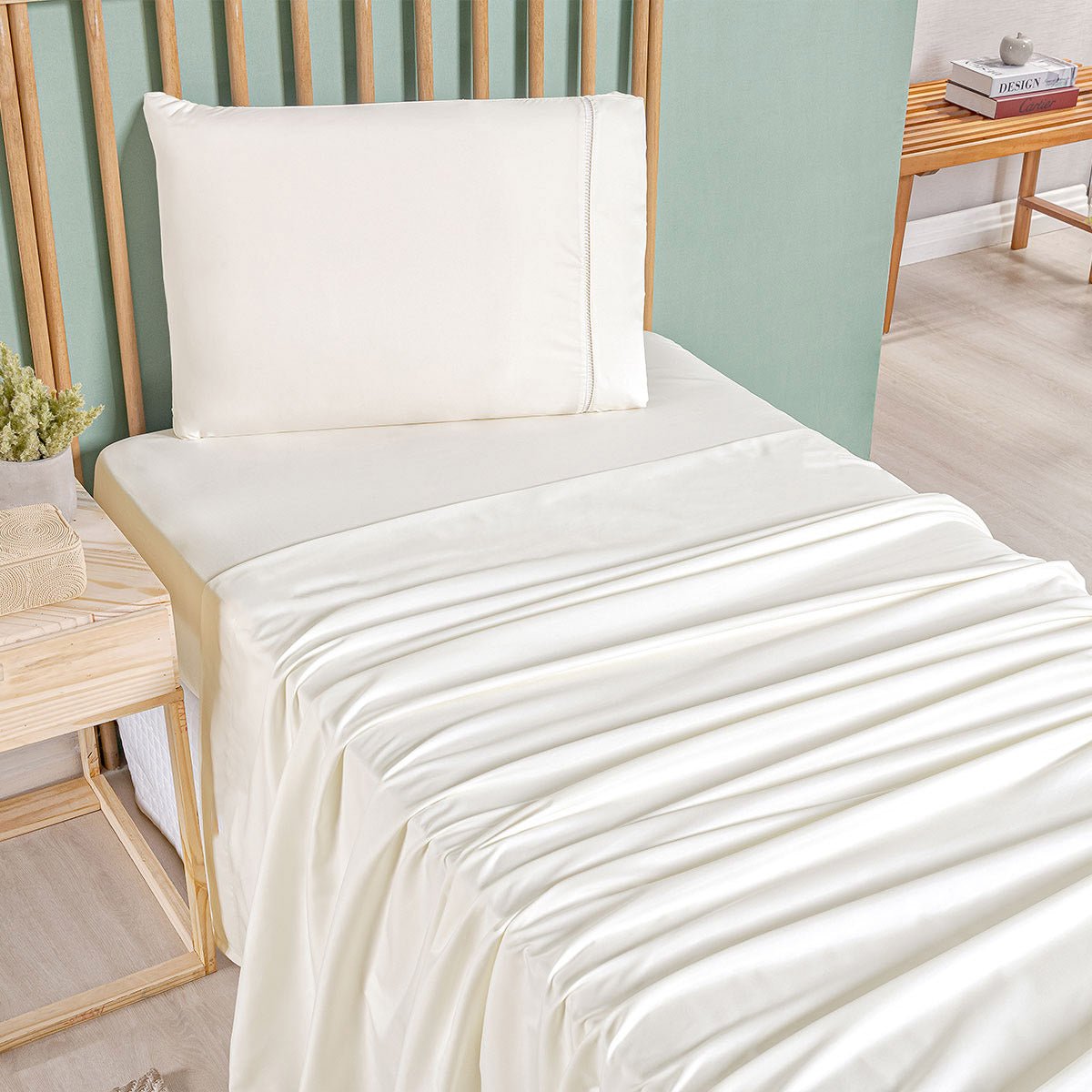 Jogo de Lençol Solteiro Camilly 400 Fios Elegância Minimalista 2 Peças - Marfim400 FiosMais VendidosElegância e sobriedade para sua cama. Jogo de Lençol Camilly com cores neutras, toque macio e o charmoso acabamento em ponto palito. Compre online! 1 Lençol com Elástico 1,88m x 0,88m x 0,30m1 Fronha 70cm x 50 cm Composição:Tecido: 100% Poliéster | Percal 400...SOLTEIRO a partir de