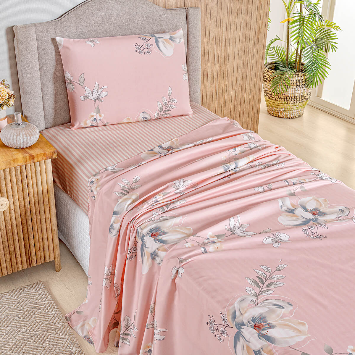 Jogo de Lençol Emilly Solteiro Elegância em Cores Vivas 3 Peças - Rosê400 FiosCama de solteiro completa e cheia de personalidade. Jogo de Lençol Emilly 3 peças com cores que não desbotam e o elegante acabamento em ponto palito. 1 Lençol de Cima 2,45m x 1,50m1 Lençol c/elástico na volta toda de 1,88m x 0,88m x 0,30m1...SOLTEIRO a partir de