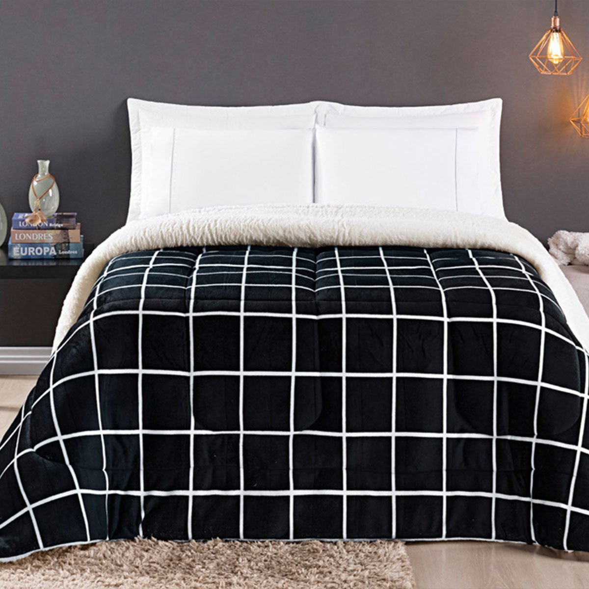 Coberdrom King Austin Calor Intenso com Design Moderno - PretoLançamentoInvernoToque MacioMáximo calor e estilo para sua cama king. Coberdrom Austin com enchimento extra, toque flannel e o conforto da lã de carneiro (sherpa). Ideal para o inverno. 1 Coberdrom 2,60m x 2,40m Composição:Manta Fleece: 100% PoliésterSherpa: 100% PoliésterEnchimento: Manta Siliconizada 100% PoliésterKING a partir de