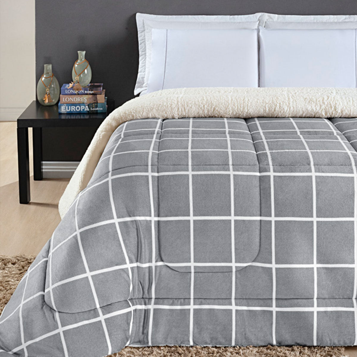 Coberdrom Queen Austin Calor Intenso com Design Moderno - CinzaLançamentoInvernoToque MacioA solução para o frio intenso. Coberdrom Queen Austin com enchimento extra, toque flannel e o calor da lã de carneiro (sherpa). Conforto e estilo para seu quarto. 1 Coberdrom 2,40m x 2,20m Composição:Manta Fleece: 100% PoliésterSherpa: 100% PoliésterEnchimento: Manta Siliconizada 100% PoliésterQUEEN a partir de
