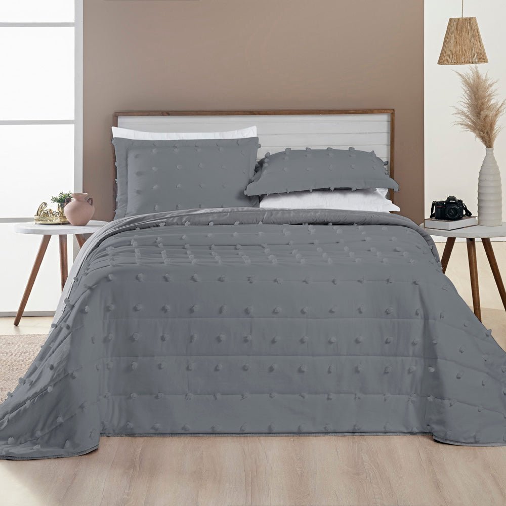 Cobre Leito Queen Poppy Aconchego e Estilo em Alto Relevo - CinzaLançamentoToque MacioDê vida e textura à sua cama queen. Cobre Leito Poppy dupla face com o design divertido dos pompons em relevo e a maciez do tecido 300 fios. Moderno e aconchegante 1 Colcha 2,60m x 2,40m2 Porta travesseiros 80cm x 55cm c/ Aba Americana...QUEEN a partir de