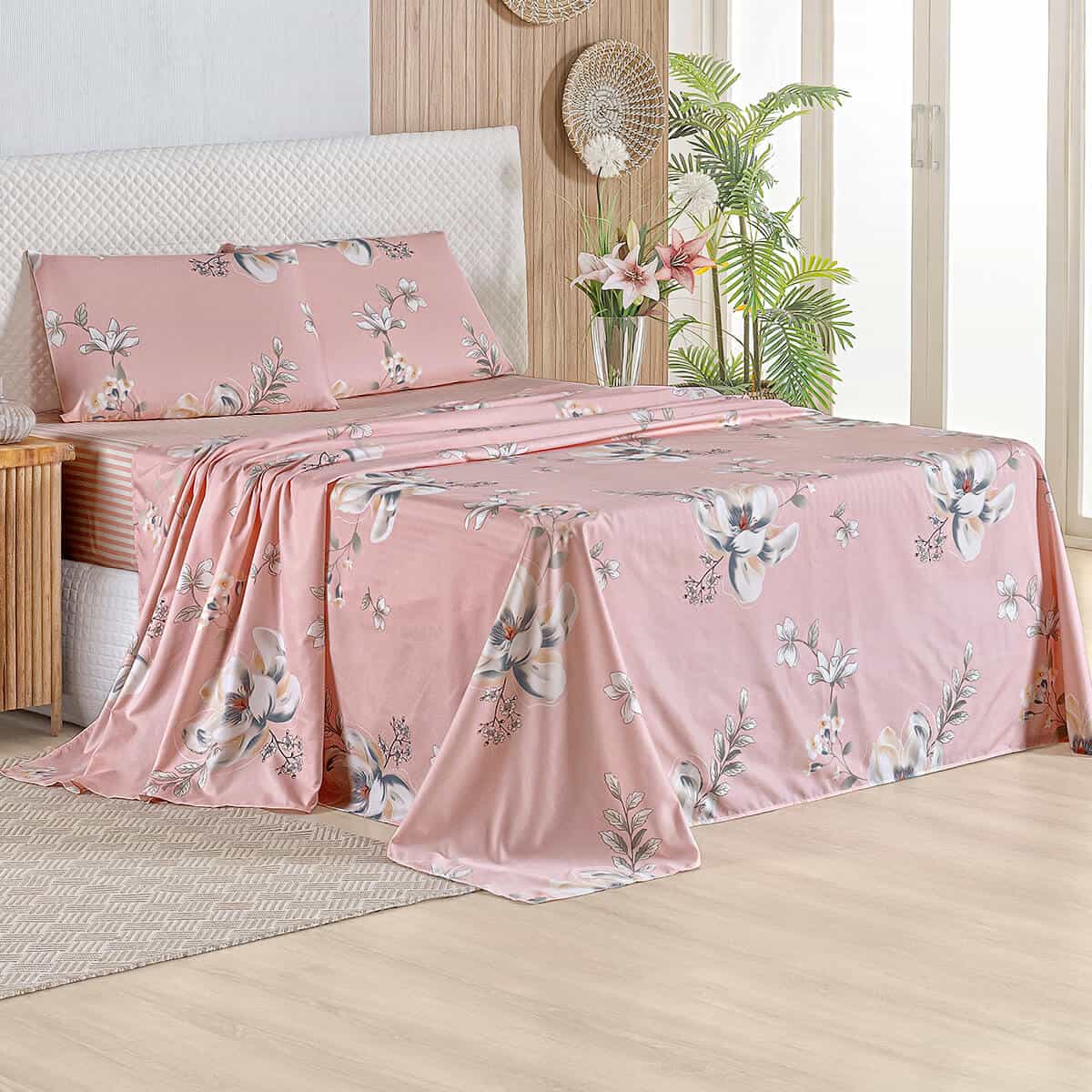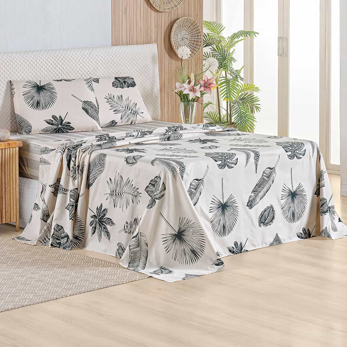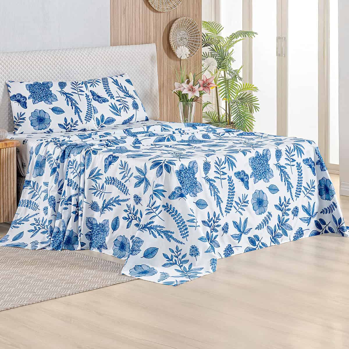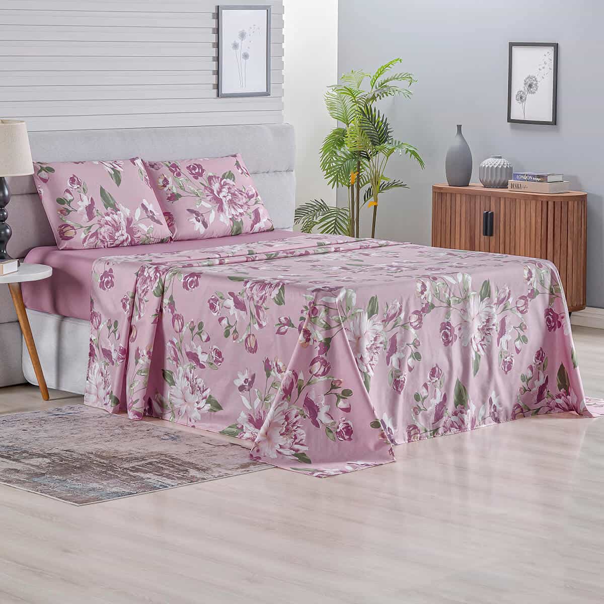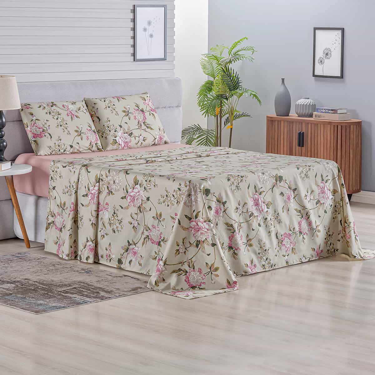 Jogo de Lençol Casal Avere Completo 4 Peças Floral 200 Fios - BothanicaToque MacioCama de casal completa e romântica. Jogo de Lençol Avere 4 peças com estampa floral delicada no lençol de cima e fronhas, e o conforto do tecido 200 fios. 01 Lençol de Cima: 2,40m x 2,20m01 Lençol de Baixo com elástico: 1,88m x 1,38m...CASAL a partir de