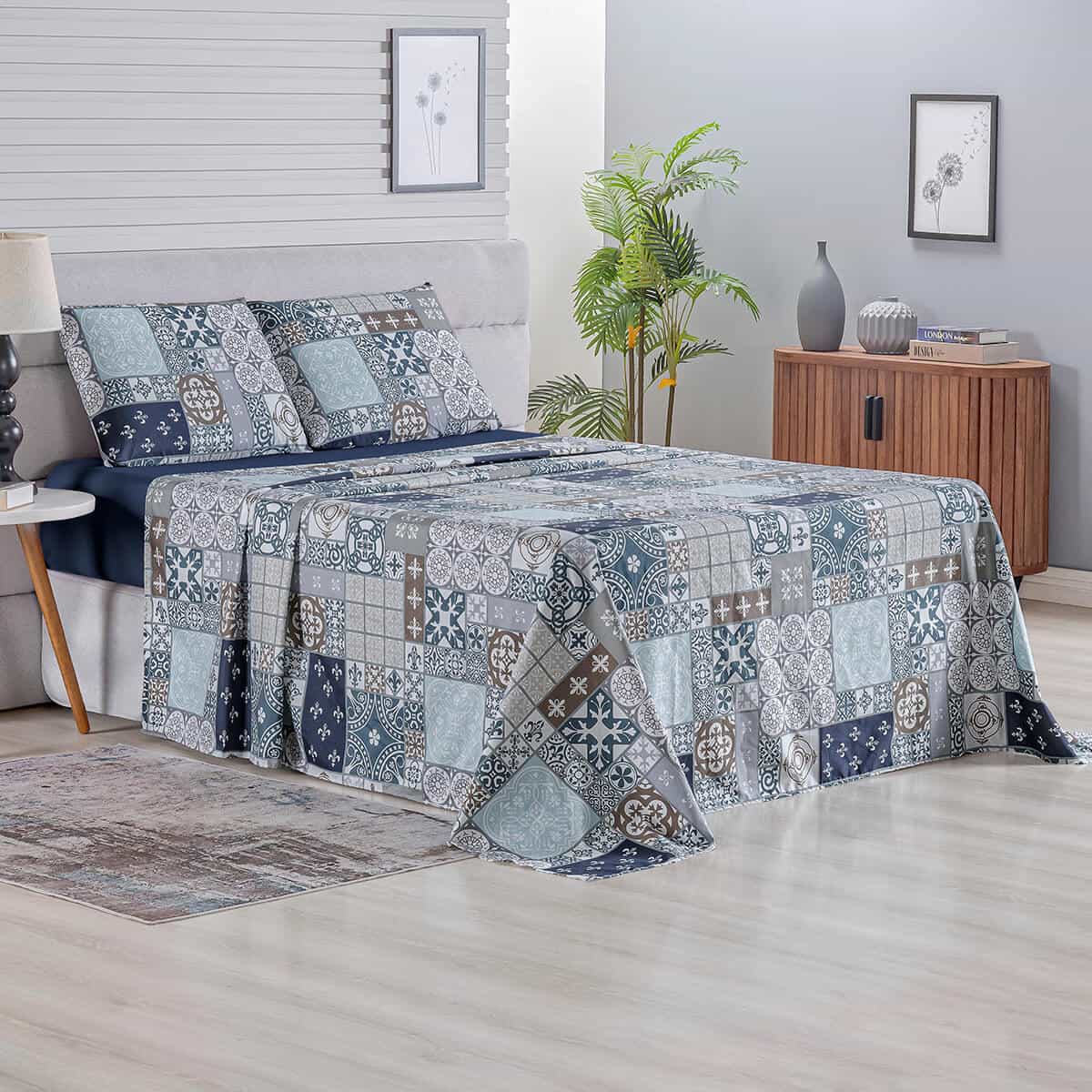 Jogo de Lençol Casal Afeto: Harmonias que Acolhem - Lolli400 FiosO toque 400 fios acolhe e o conjunto harmoniza: Florais e geométricos em composições que se entendem. Beleza que dura no seu dia a dia.1 Lençol de cima 2,40m x 2,20m1 Lençol de baixo 1,88m x 1,38m x 30cm2 Fronhas 78cm x 50cm (medida...CASAL a partir de