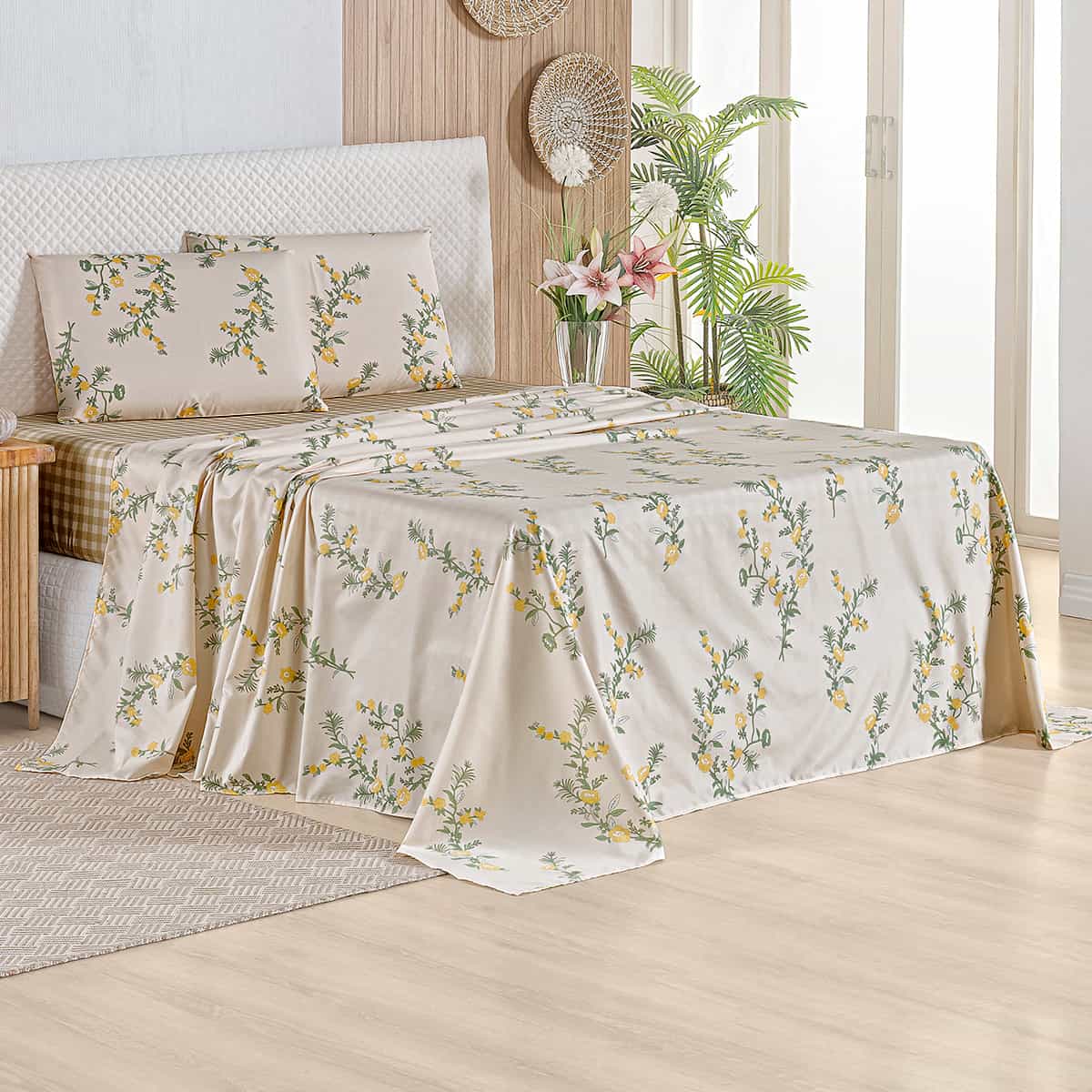 Jogo de Lençol Casal Avere Completo 4 Peças Floral 200 Fios - PrimaveraToque MacioCama de casal completa e romântica. Jogo de Lençol Avere 4 peças com estampa floral delicada no lençol de cima e fronhas, e o conforto do tecido 200 fios. 01 Lençol de Cima: 2,40m x 2,20m01 Lençol de Baixo com elástico: 1,88m x 1,38m...CASAL a partir de