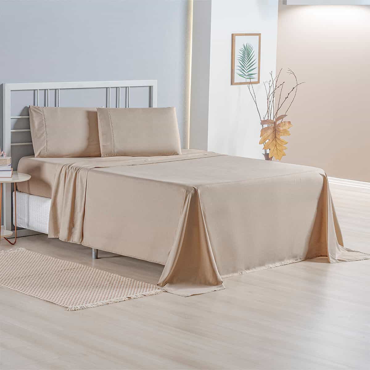 Jogo de Lençol Casal Camilly com Ponto Palito Elegância Minimalista 4 Peças - Avelã400 FiosMais VendidosA solução completa para uma cama de casal sempre elegante. Jogo de Lençol Camilly 4 peças com toque macio, cores neutras e acabamento em ponto palito. 01 Lençol de cima 2,45m x 2,20m01 Lençol de baixo com elástico 1,88m x 1,38m x 30cm alt.02...CASAL a partir de
