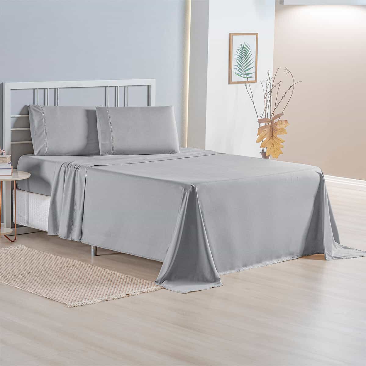 Jogo de Lençol Casal Camilly com Ponto Palito Elegância Minimalista 4 Peças - Cinza400 FiosMais VendidosA solução completa para uma cama de casal sempre elegante. Jogo de Lençol Camilly 4 peças com toque macio, cores neutras e acabamento em ponto palito. 01 Lençol de cima 2,45m x 2,20m01 Lençol de baixo com elástico 1,88m x 1,38m x 30cm alt.02...CASAL a partir de